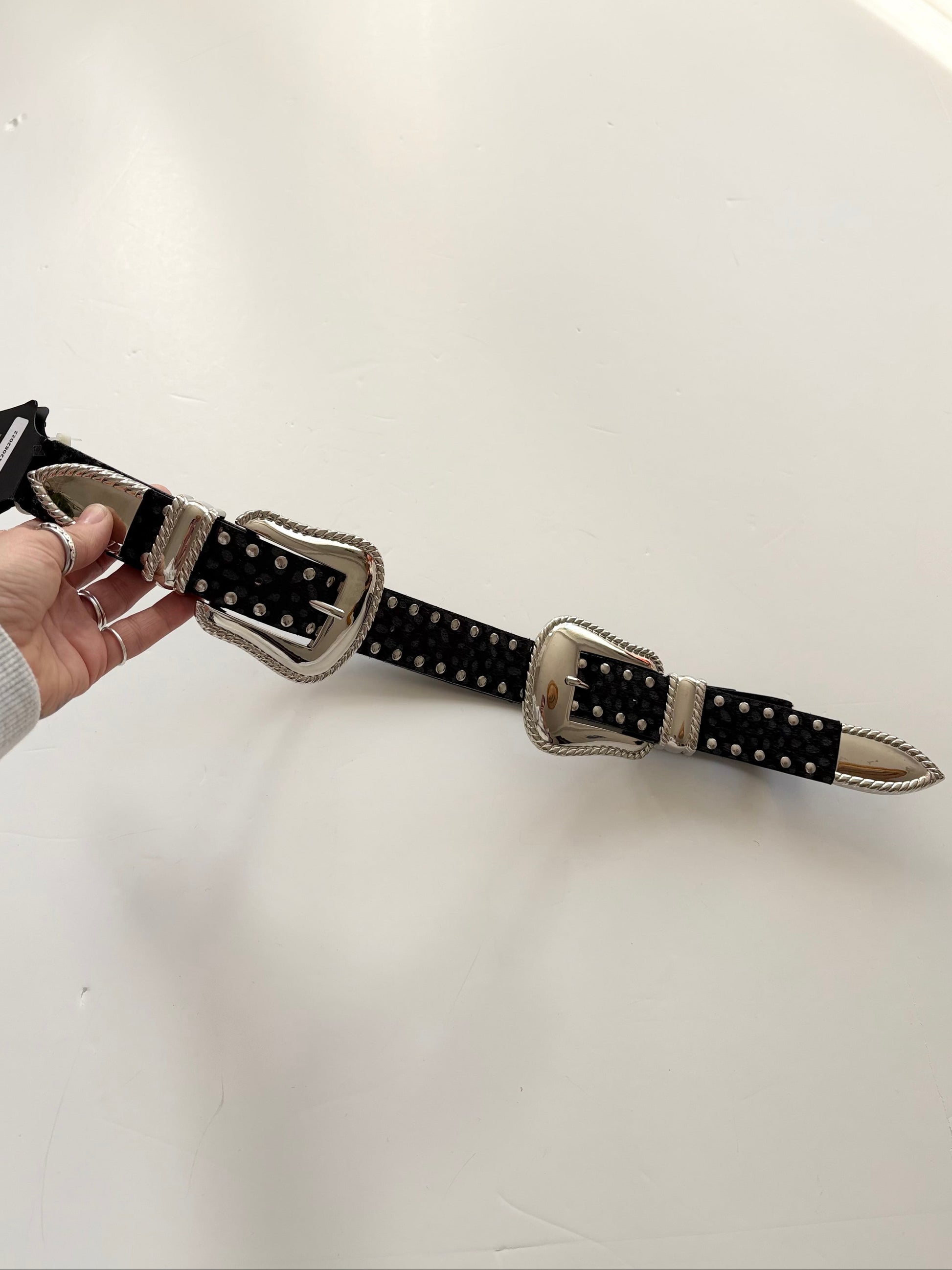 Black faux animal hair belt with double silver buckle