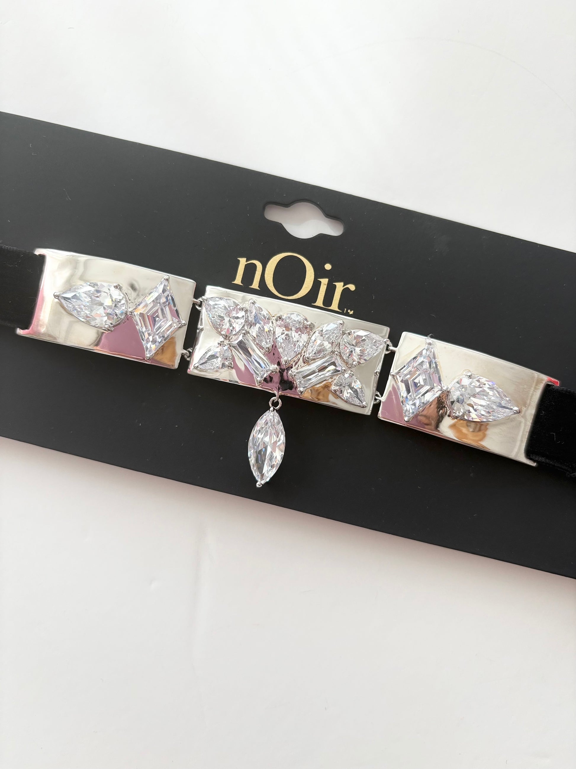 Rhodium plated and cz stone drop black velvet suede choker necklace