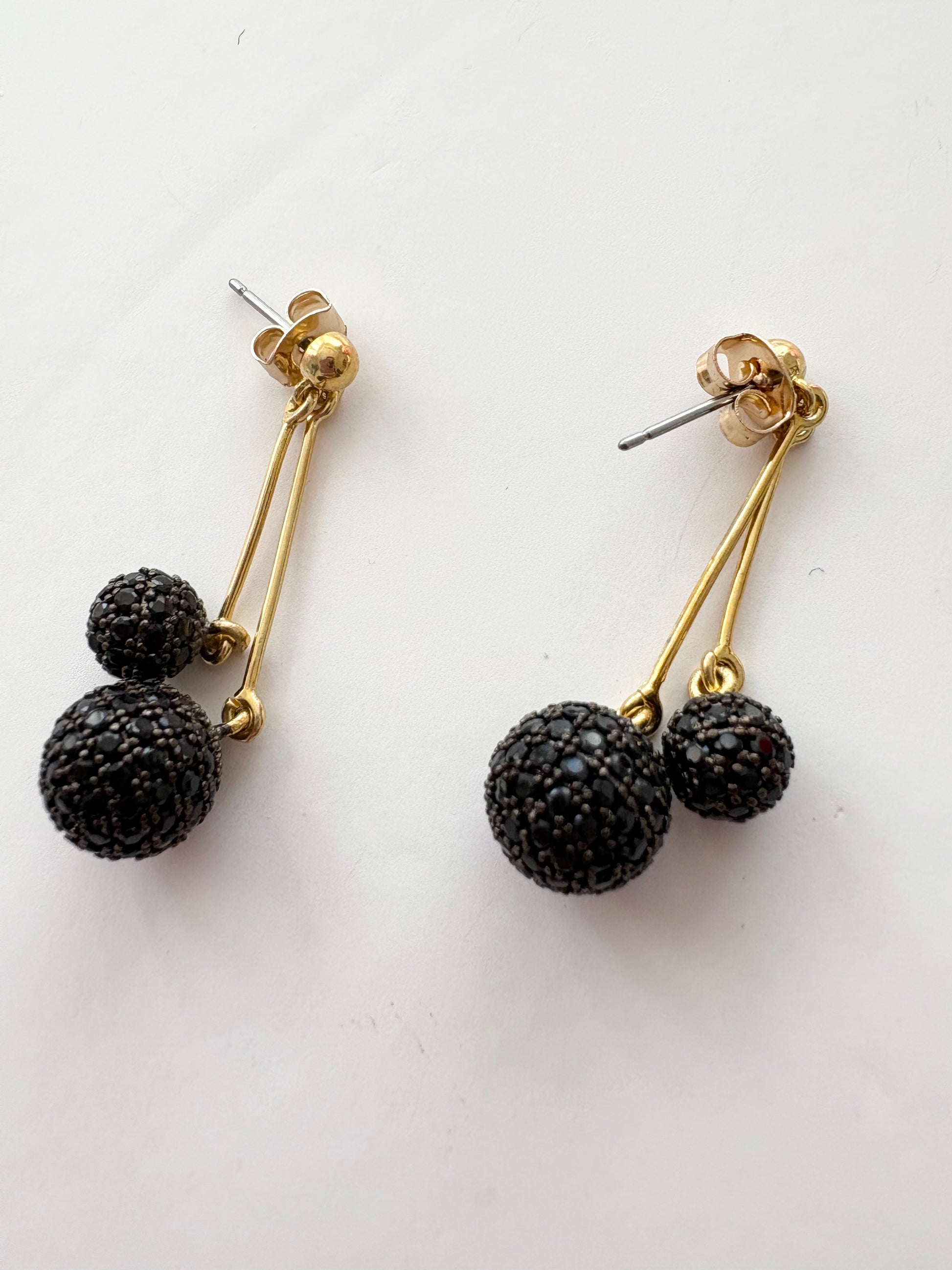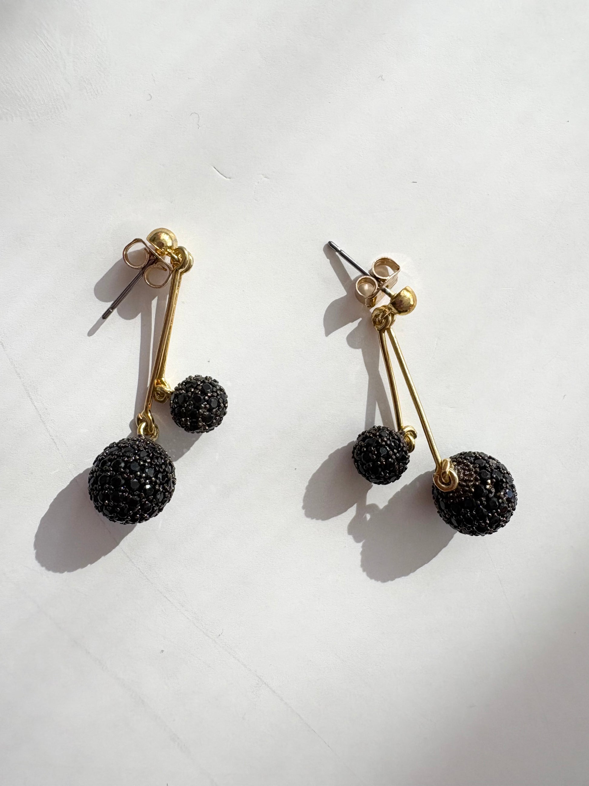 Hanging brass black CZ spheres with 18K gold plating