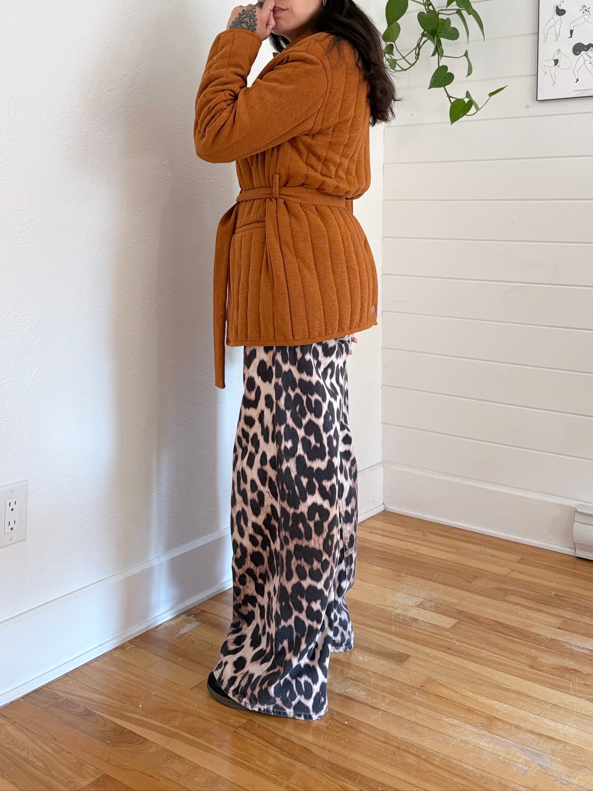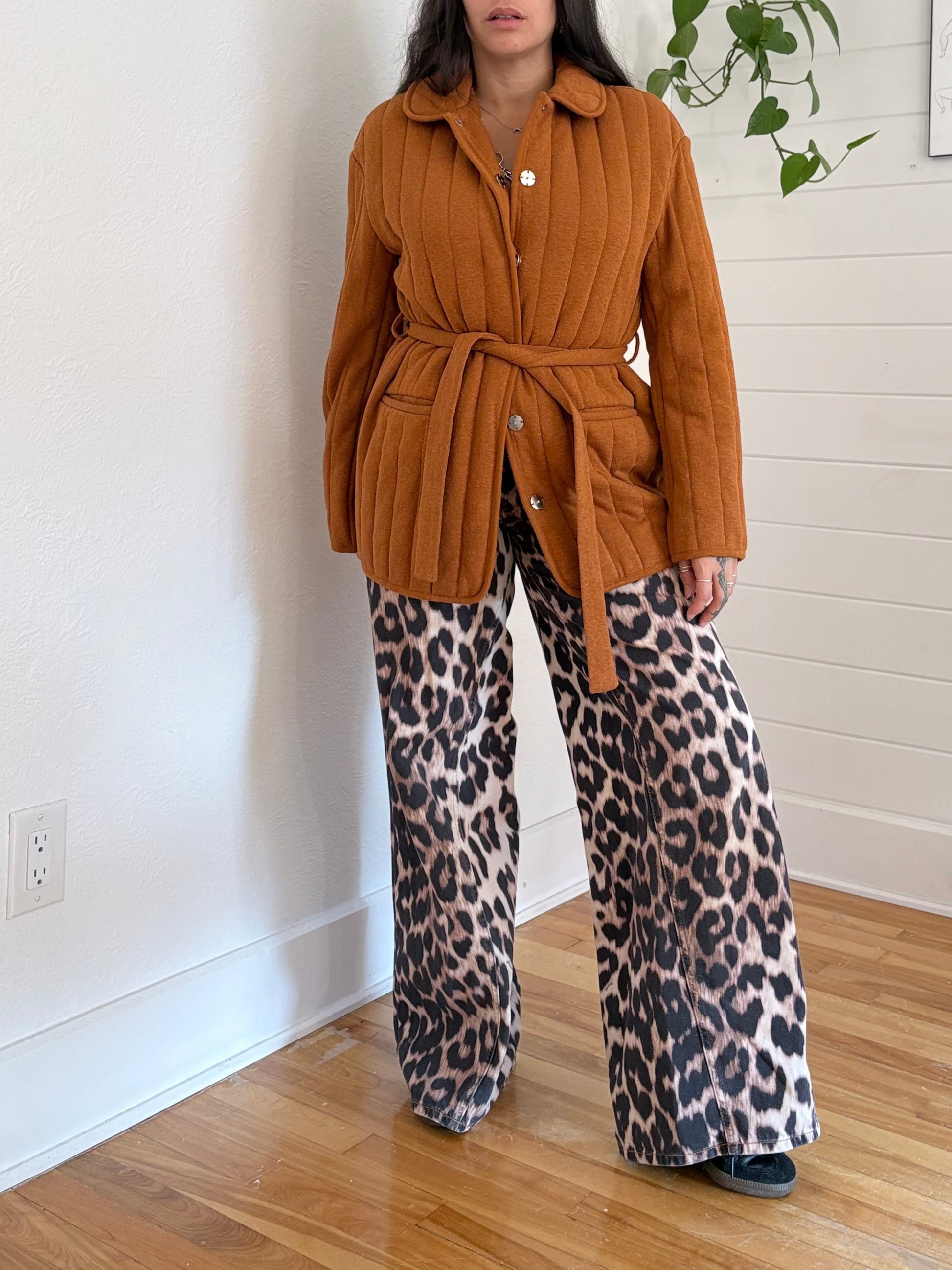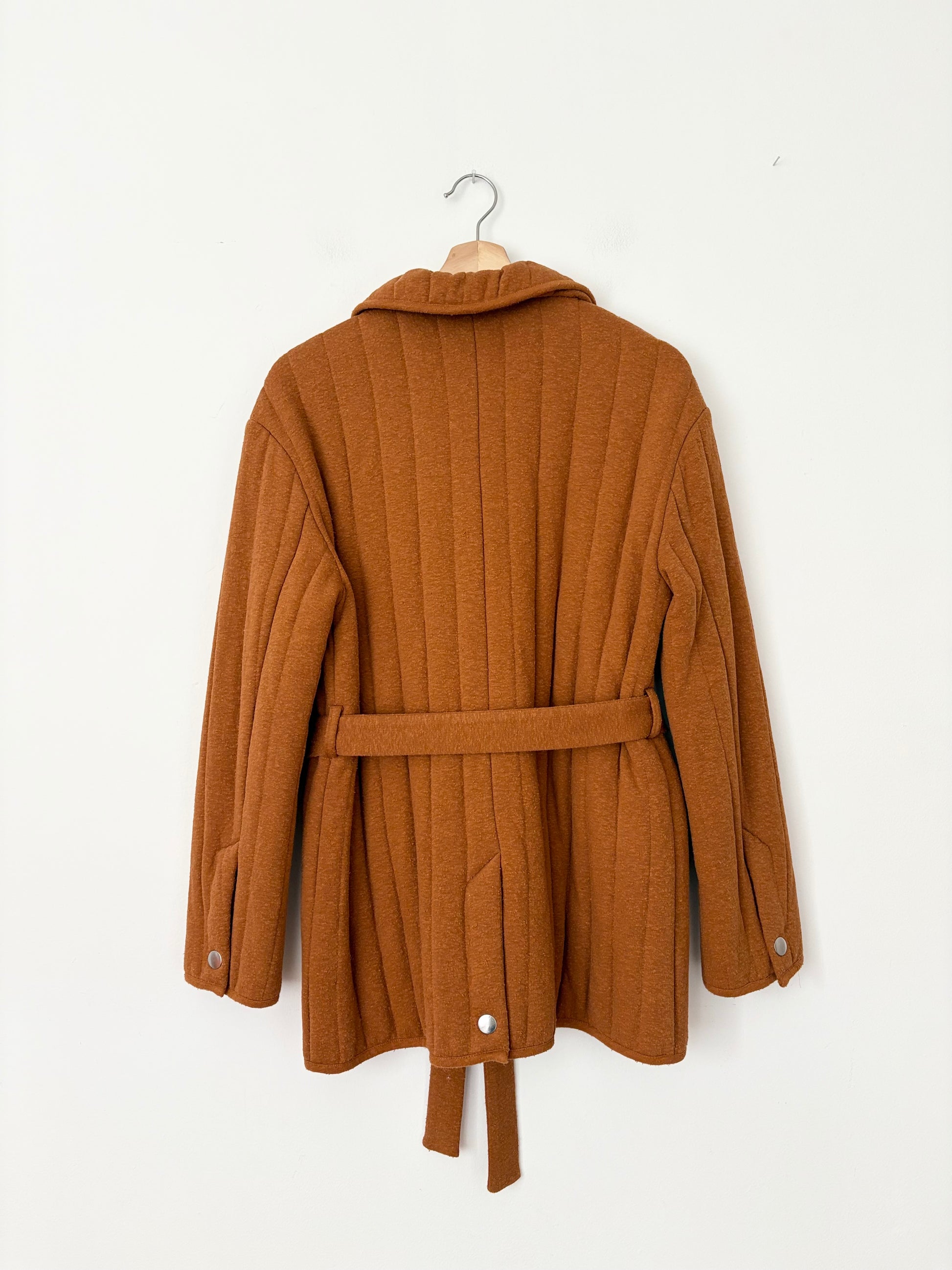 Collared textured quilted cotton blend jacket with a waist tie, two front pockets and exposed silver toned buttons.