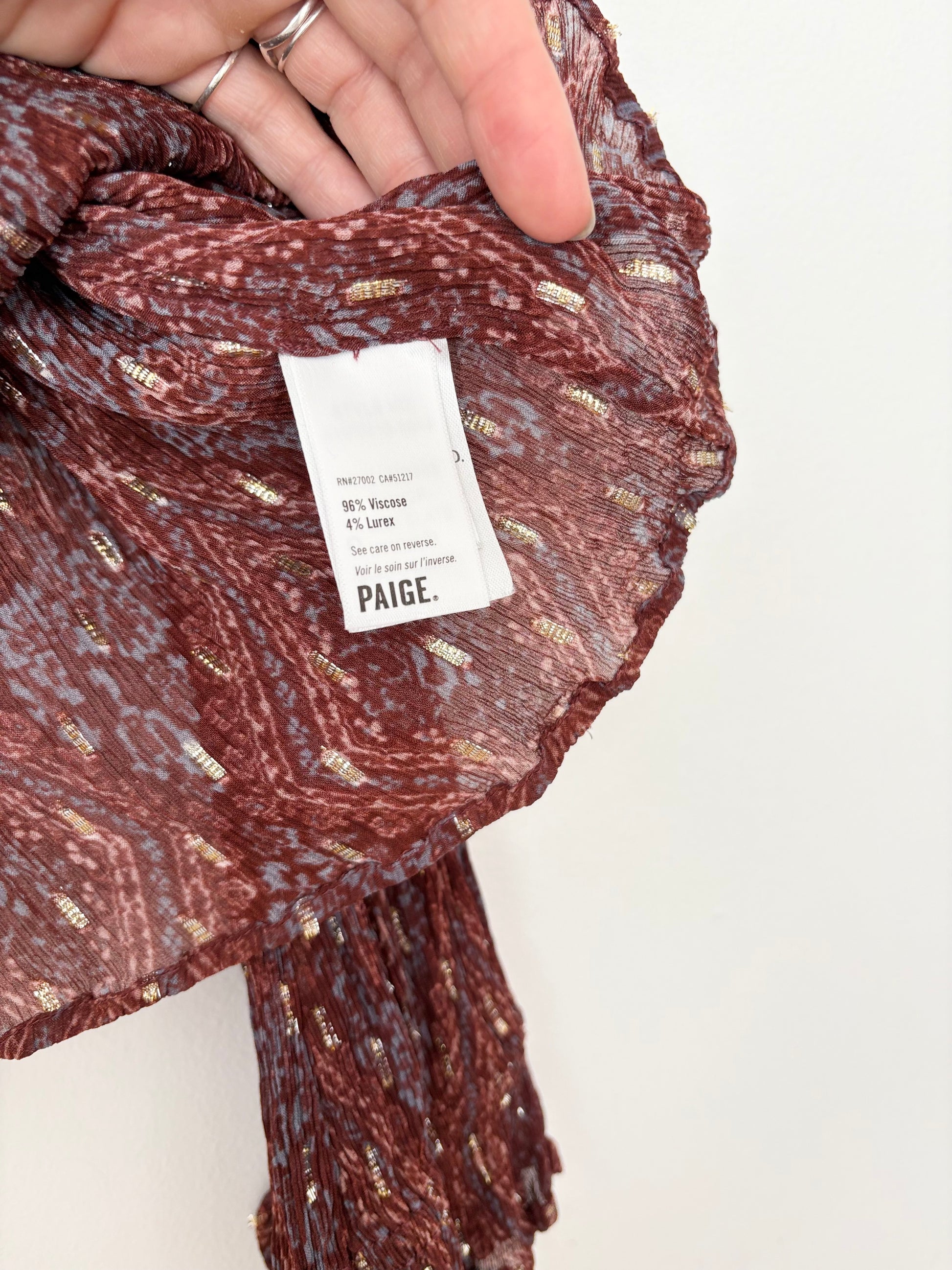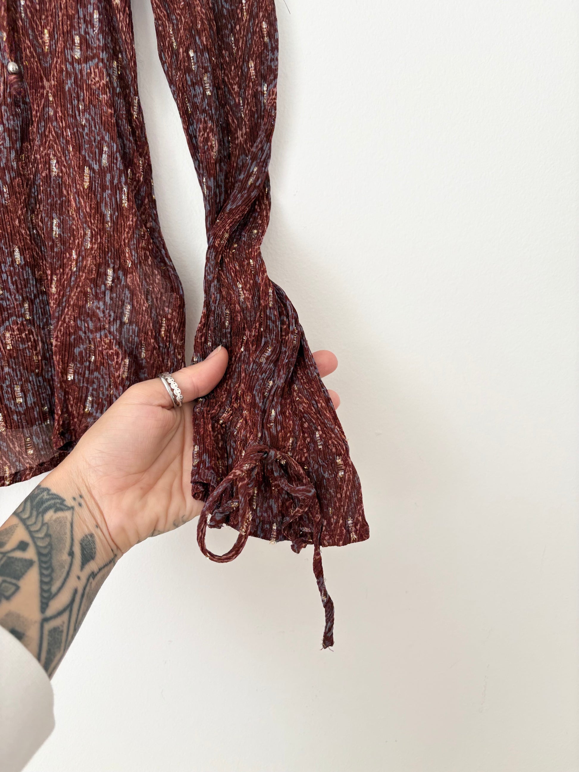 Semi sheer abstract printed blouse with split neckline, pleated collar & tie detail