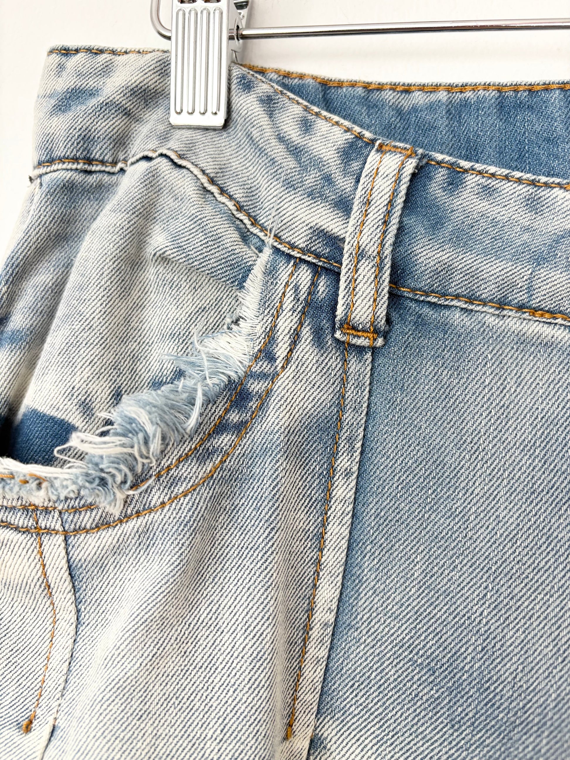 Distressed pleated wide leg jeans with studs on the side seam and slits at hem. High waist, loose fit.