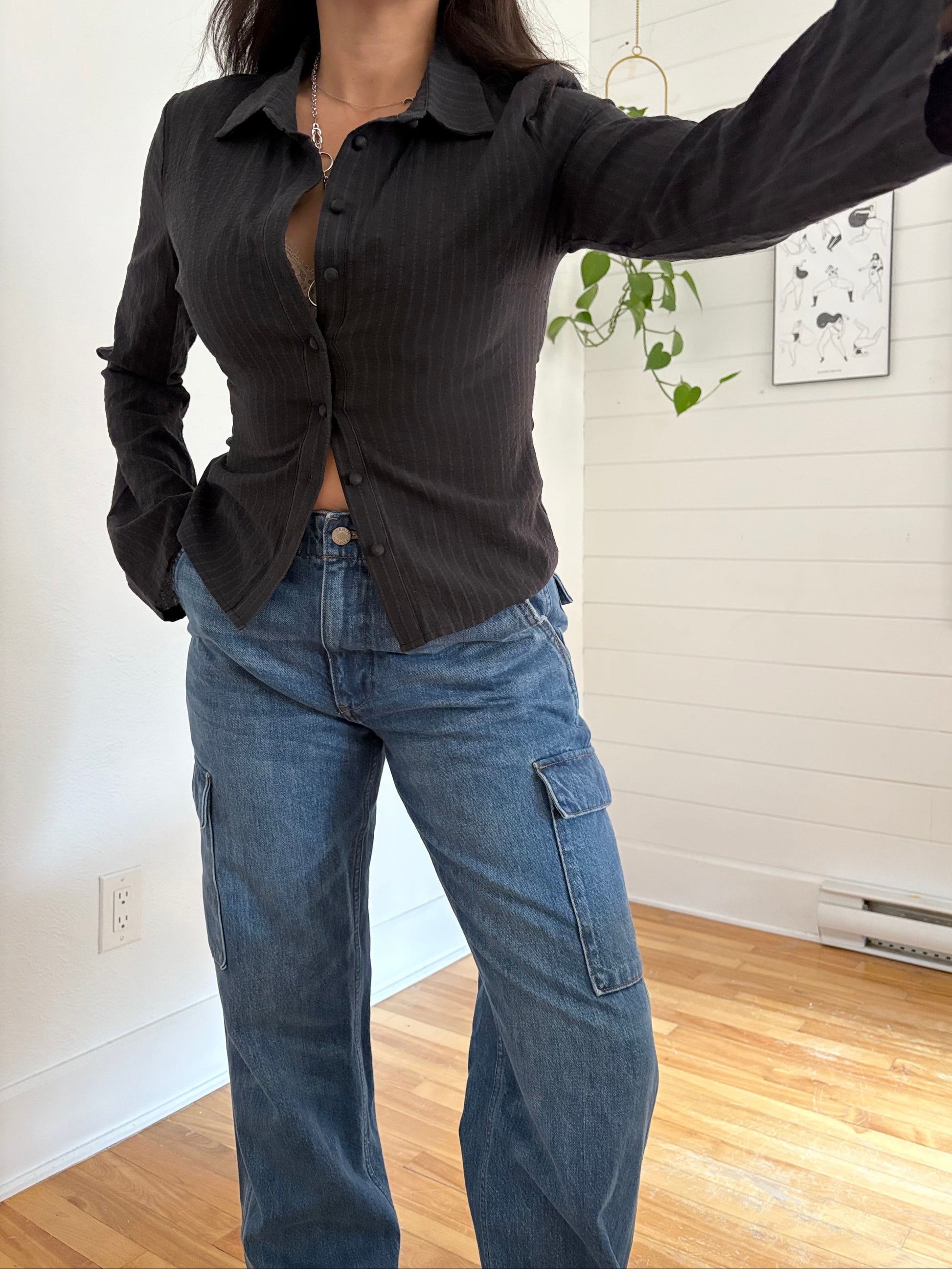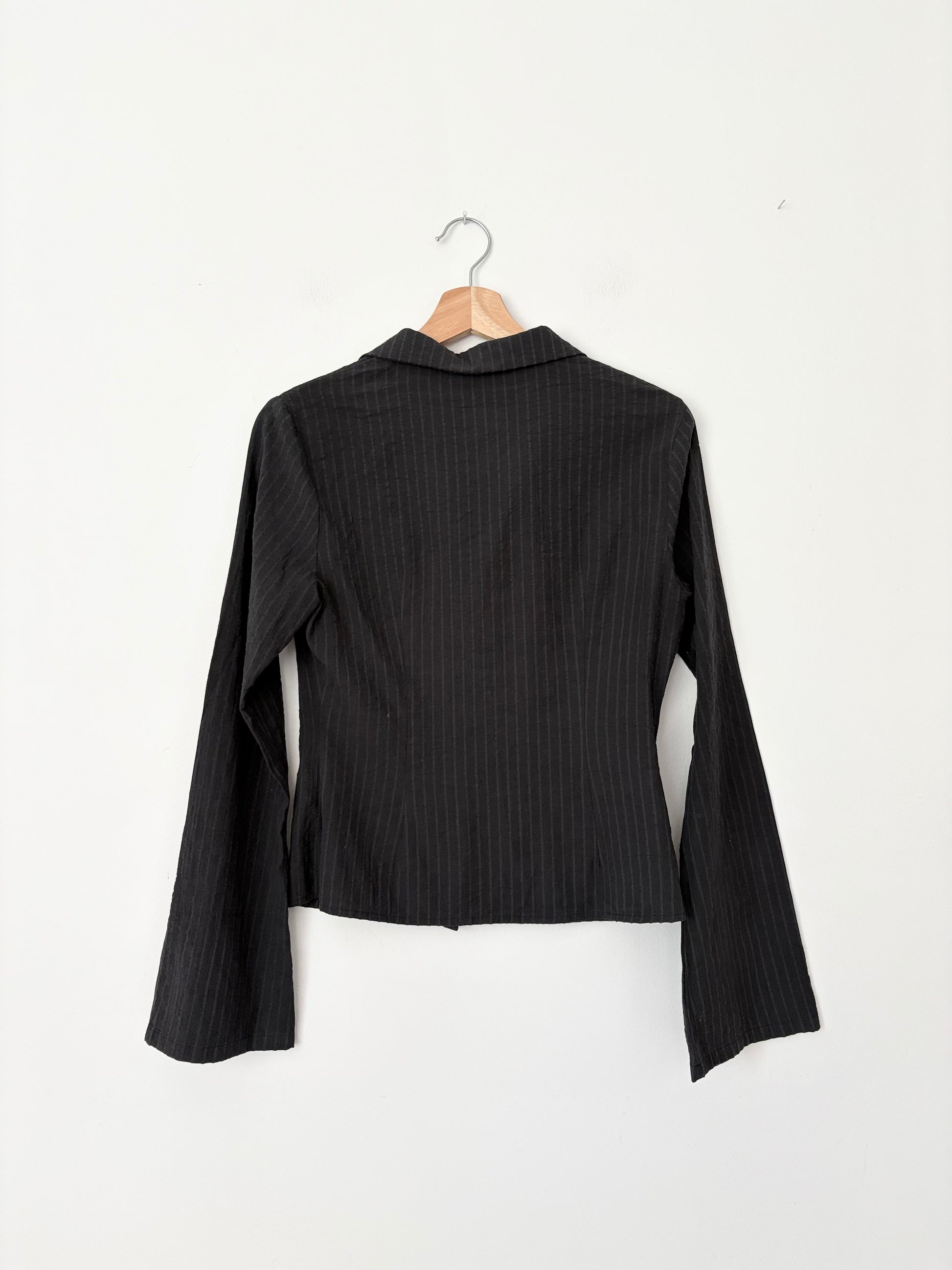 Button-up shirt featuring pinstripe print, classic collar & flare sleeves. Non-stretch