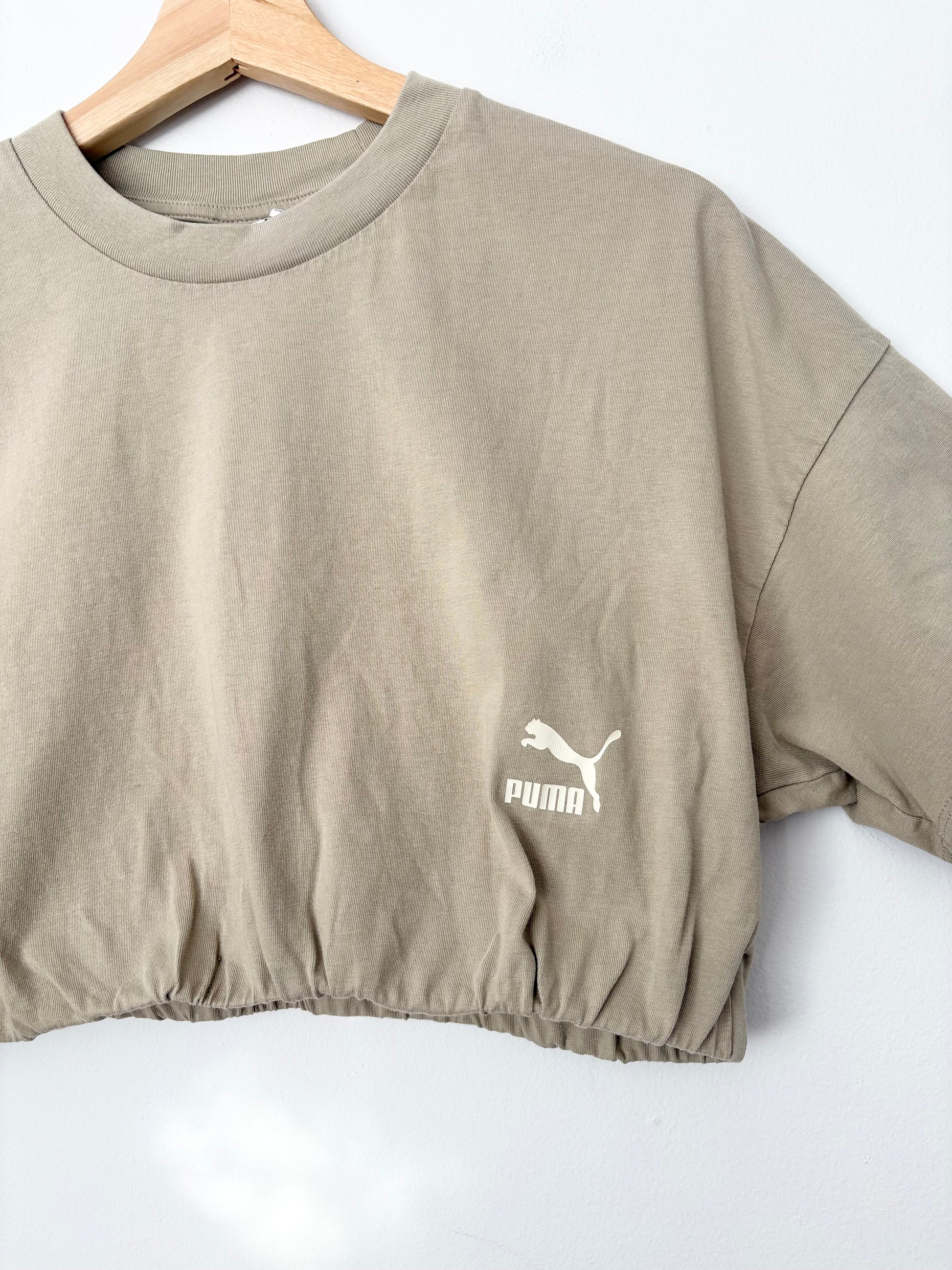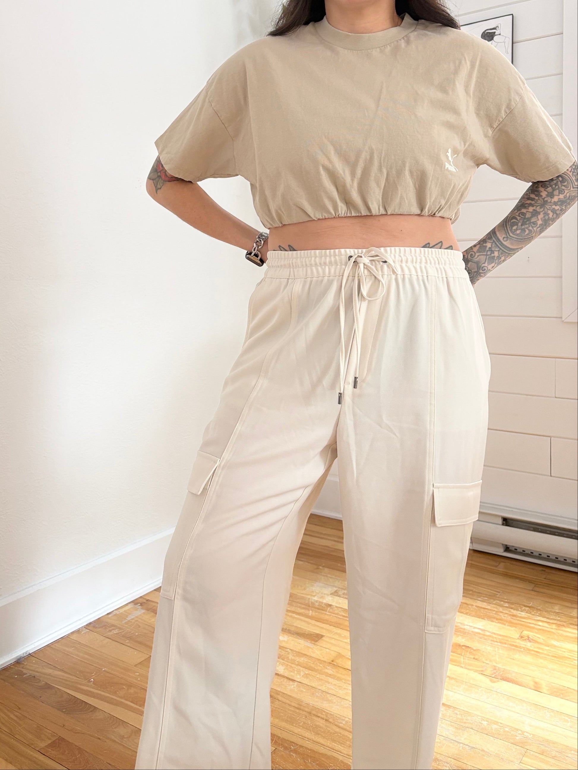 Classic roll up T shirt in beige with wide sleeves and elasticated crop hem
