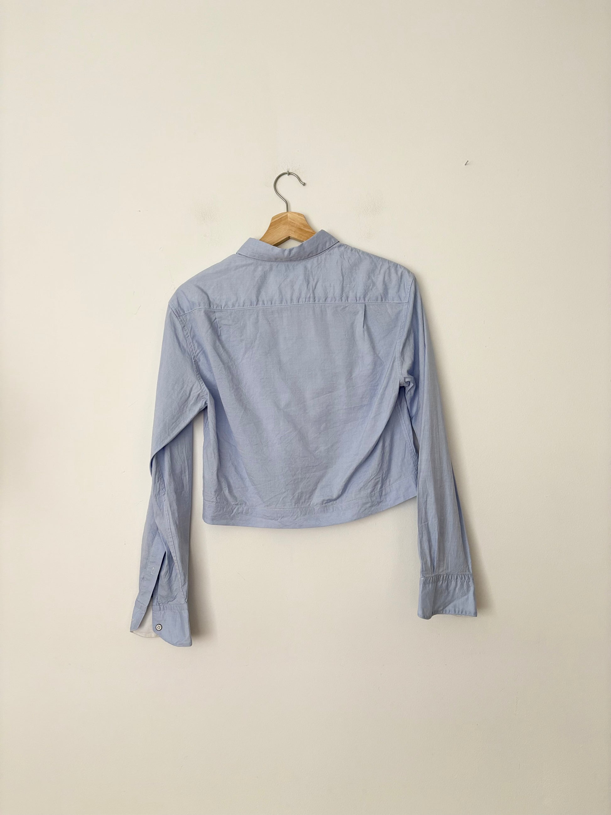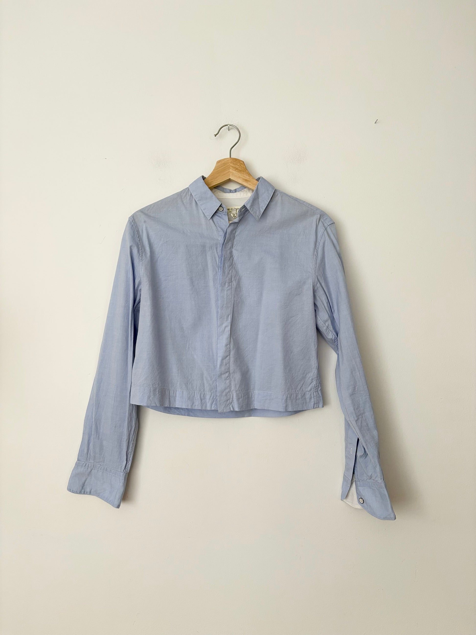 Crisp, cotton poplin button‑down featuring a boxy silhouette, spread collar, and a modern cropped length that sits above the hip. Its minimalist tailoring gives it a sharp, structured look while staying lightweight and easy to style