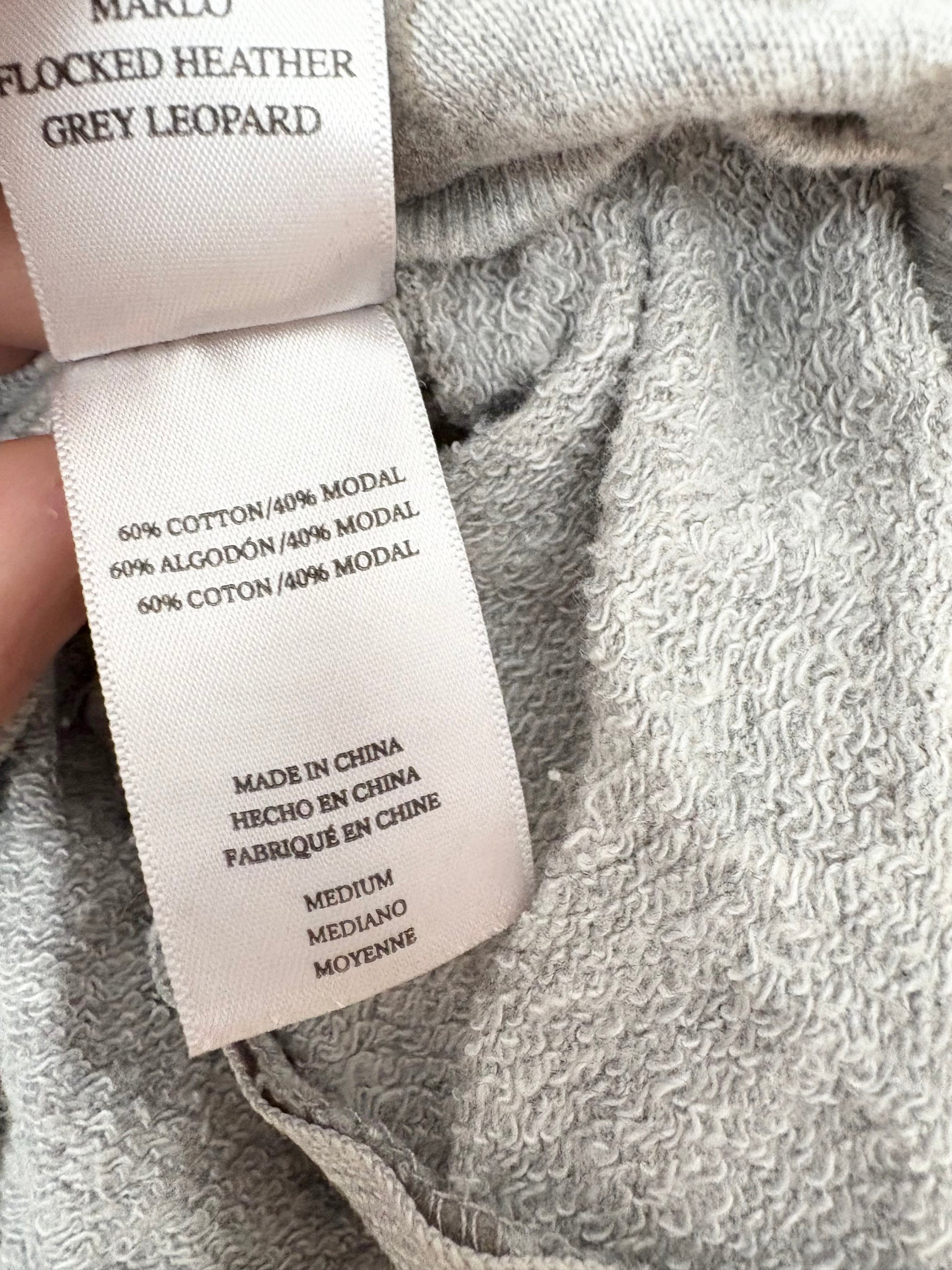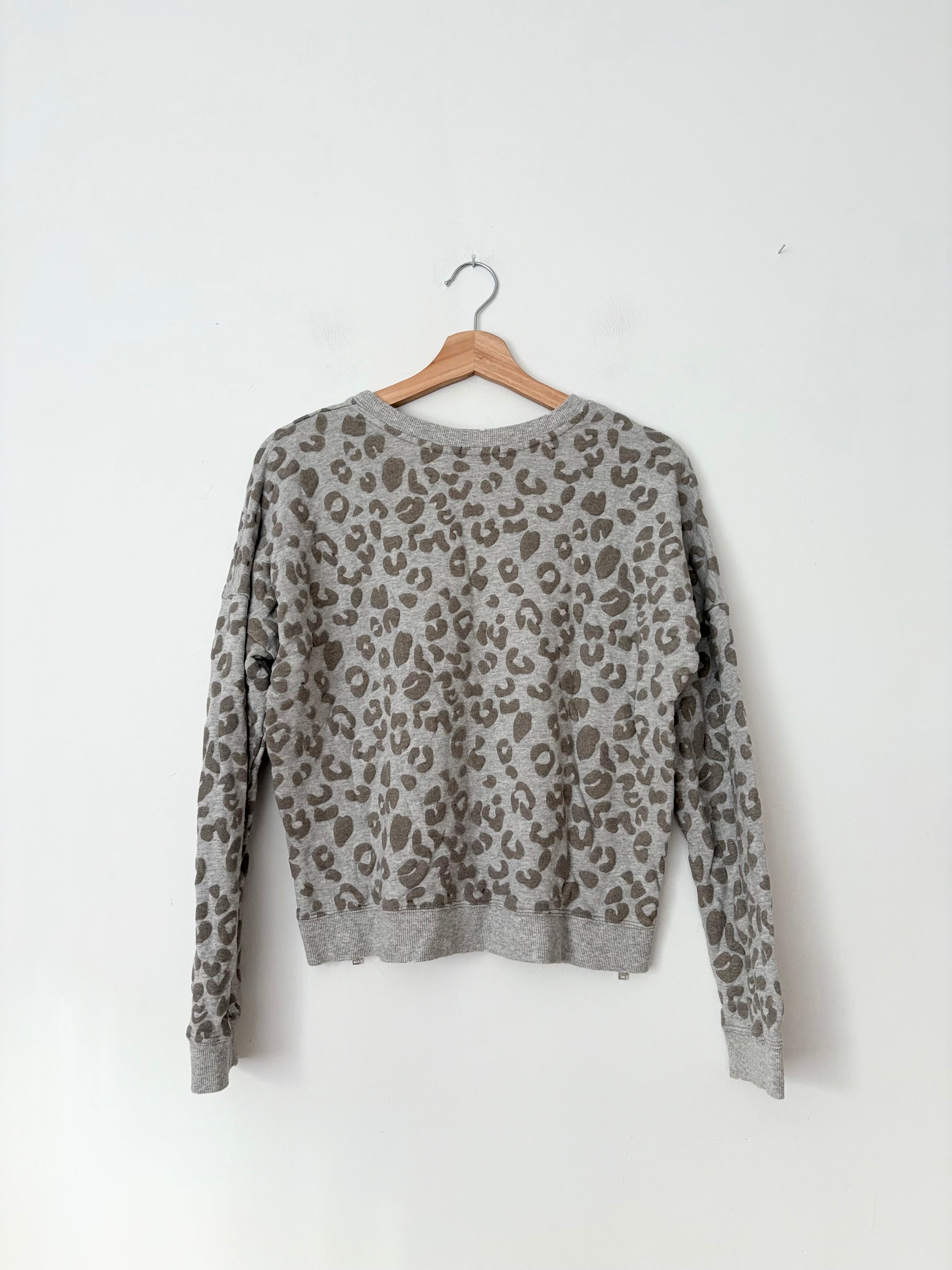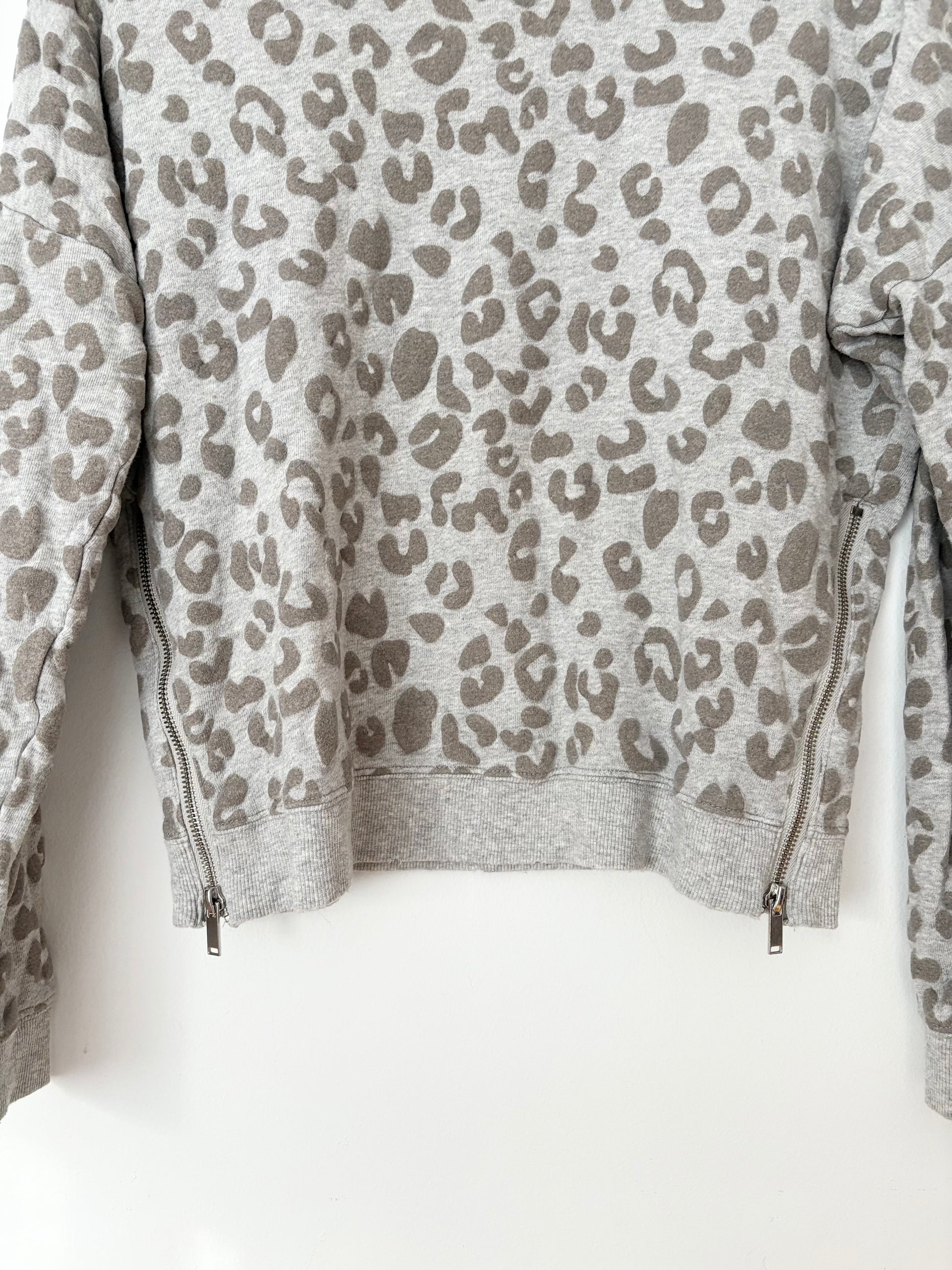 Cozy pullover sweatshirt with a flocked leopard print, crewneck silhouette, distressed hems, long sleeves and side-zip details at the hem.