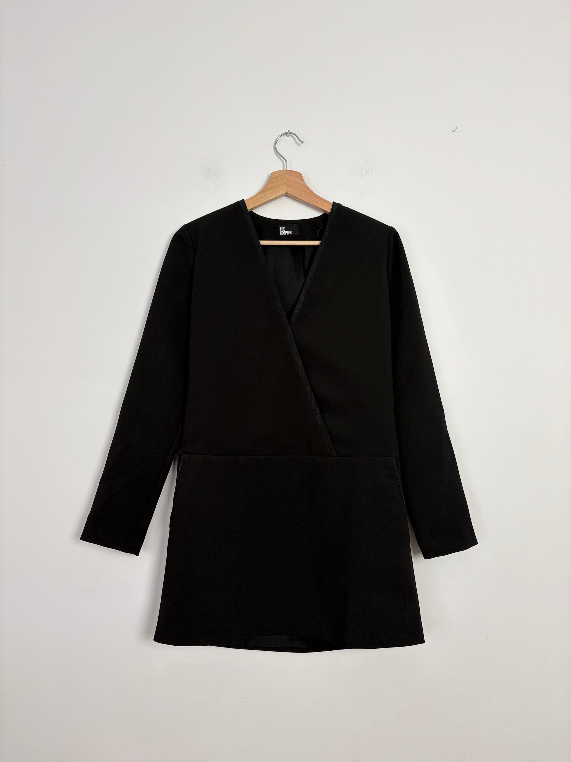 Black long sleeve fully lined crossfront mini dress with side zipper