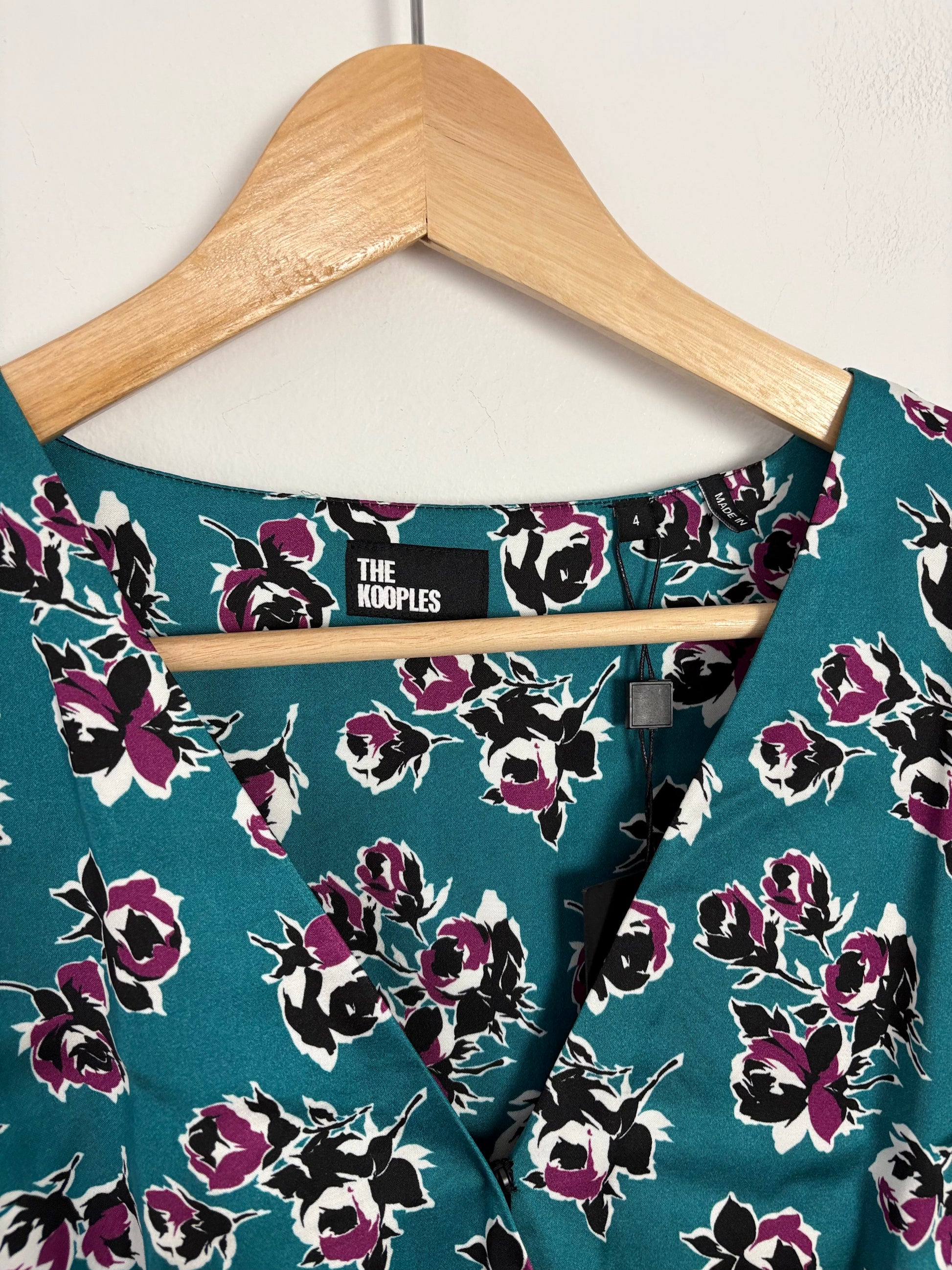 Silky floral crossover top with balloon sleeves & tone on tone buttons