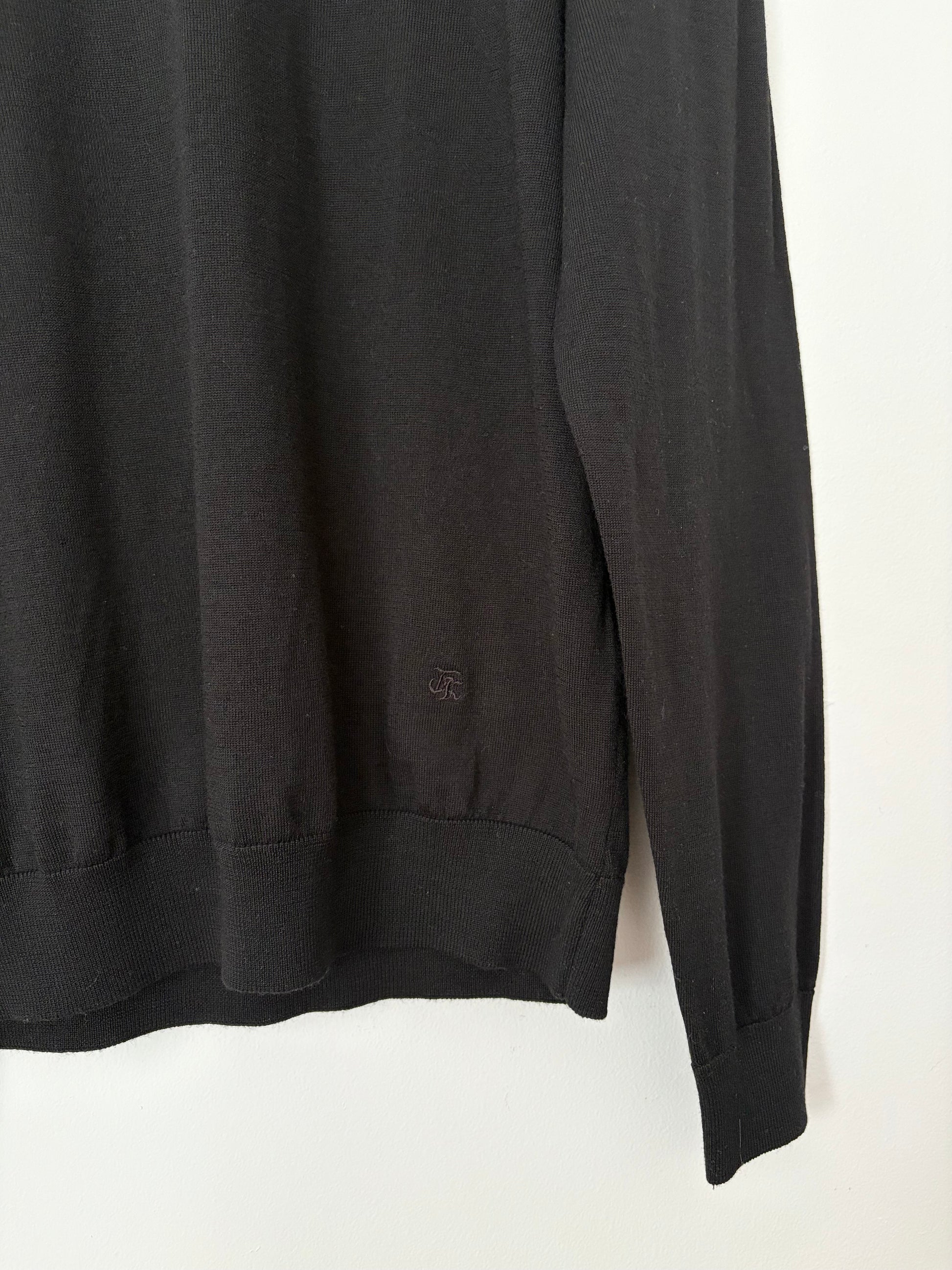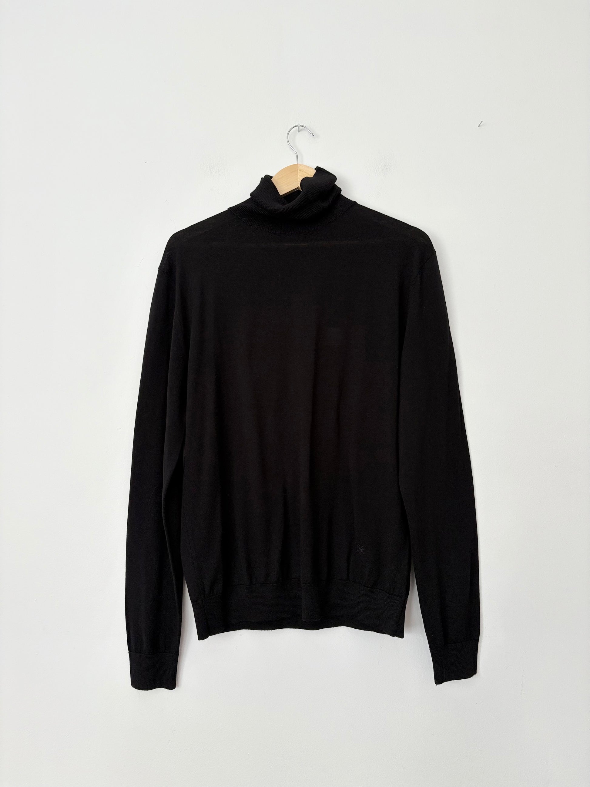Black loose fit sweater with turtleneck and tone on tone logo at bottom