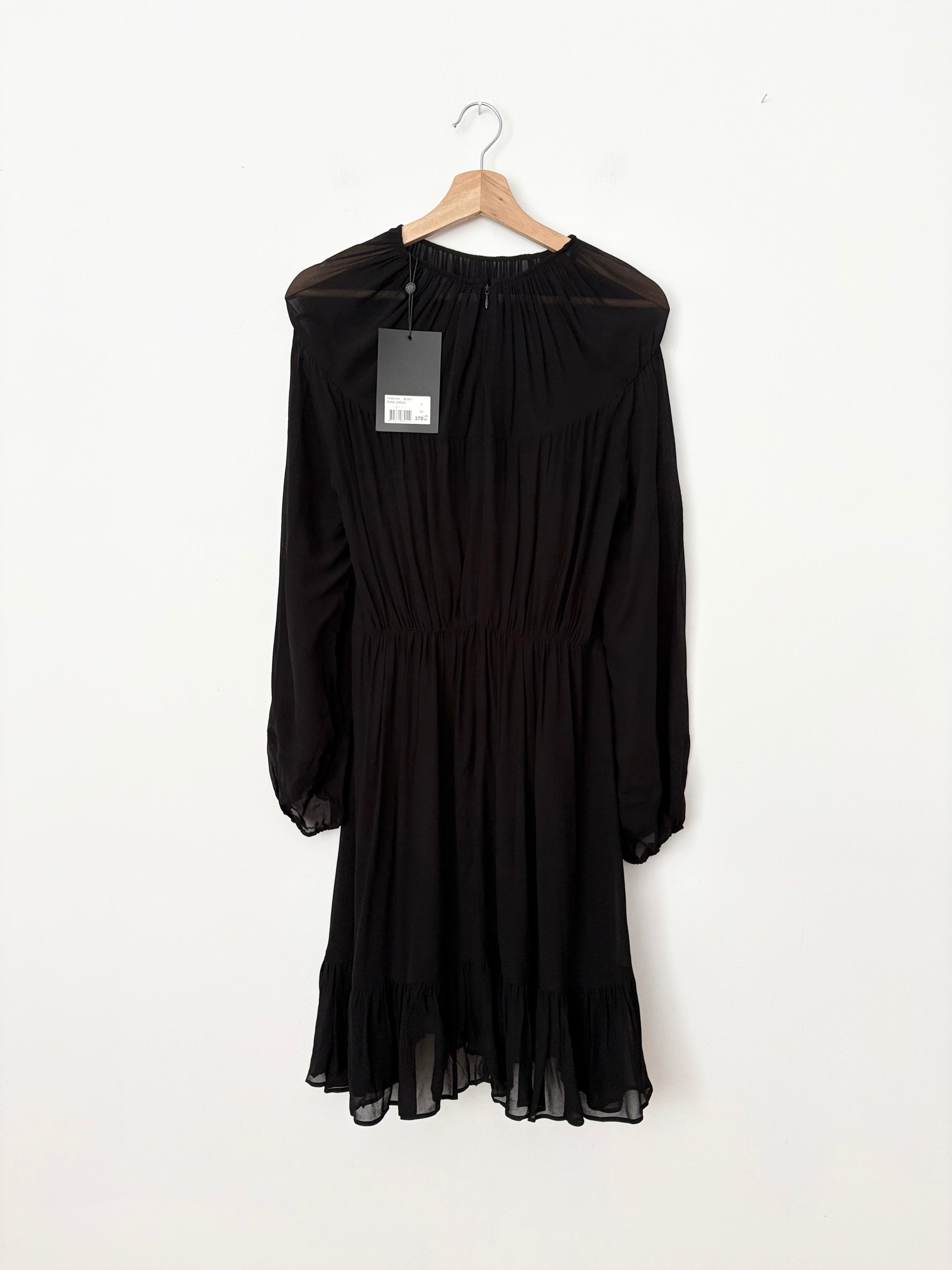 Round neck sheer ballooned sleeve dress with gathered cuffs, pleated details, elastic waistband & flouce hem. Comes with removable lining
