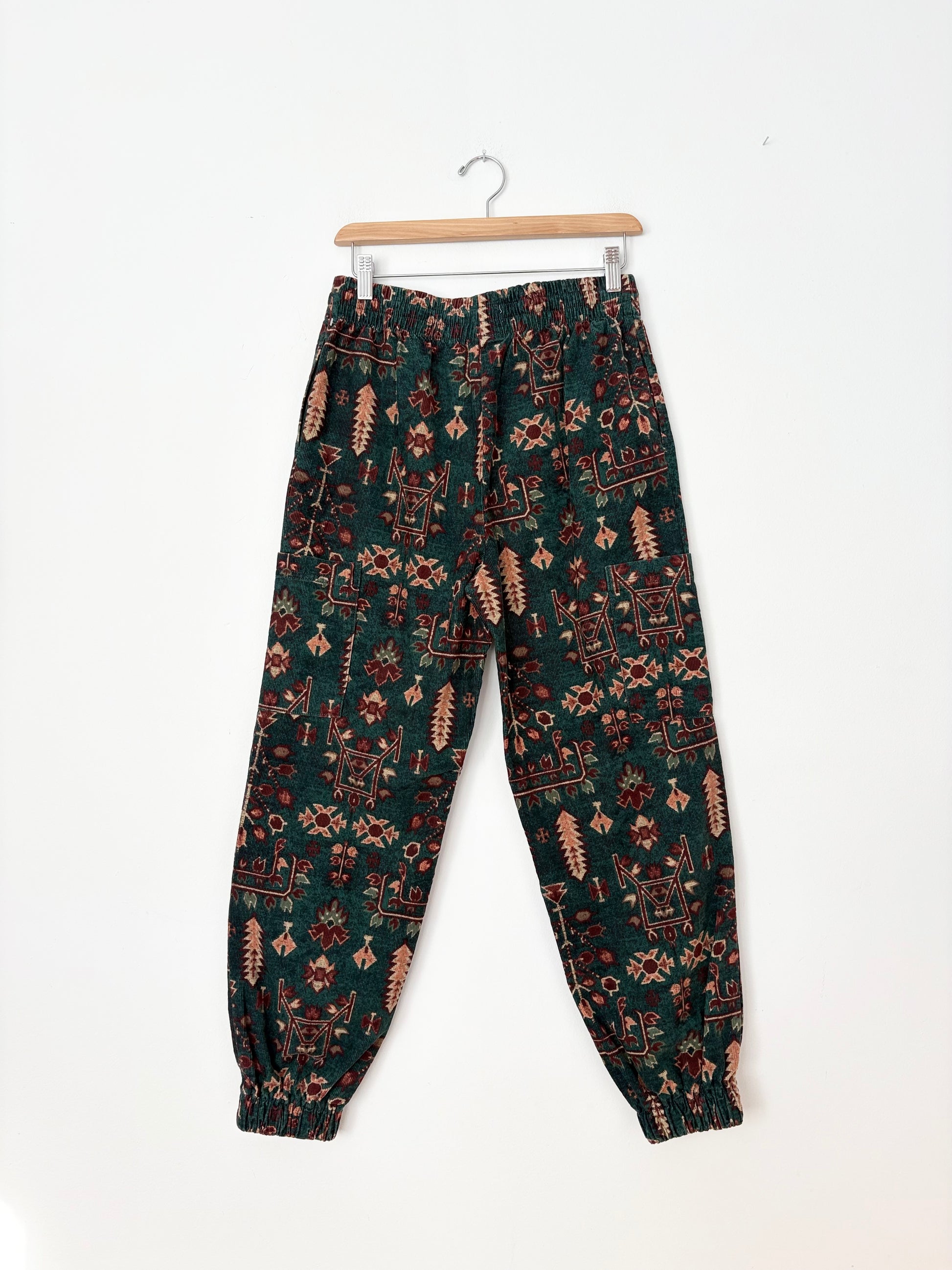 Printed pull on jogger corduroy pants featuring a southwestern print, Drawstring at waist, relaxed fit through the tapered leg and elastic banding at the waist and cuffs.