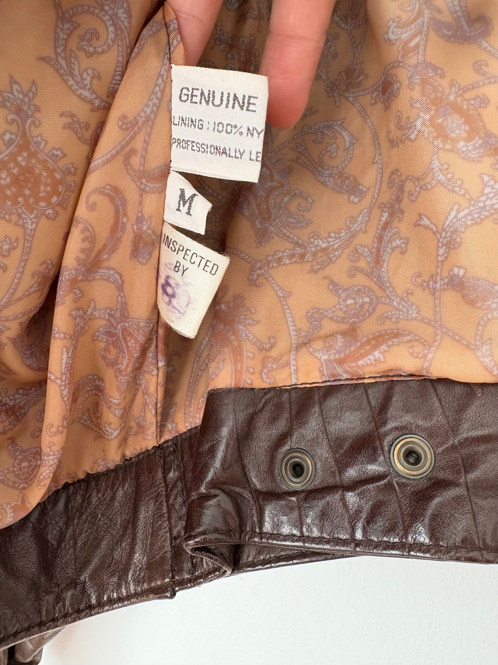 Chocolate brown crocodile leather crop bomber with shoulder pad and button front