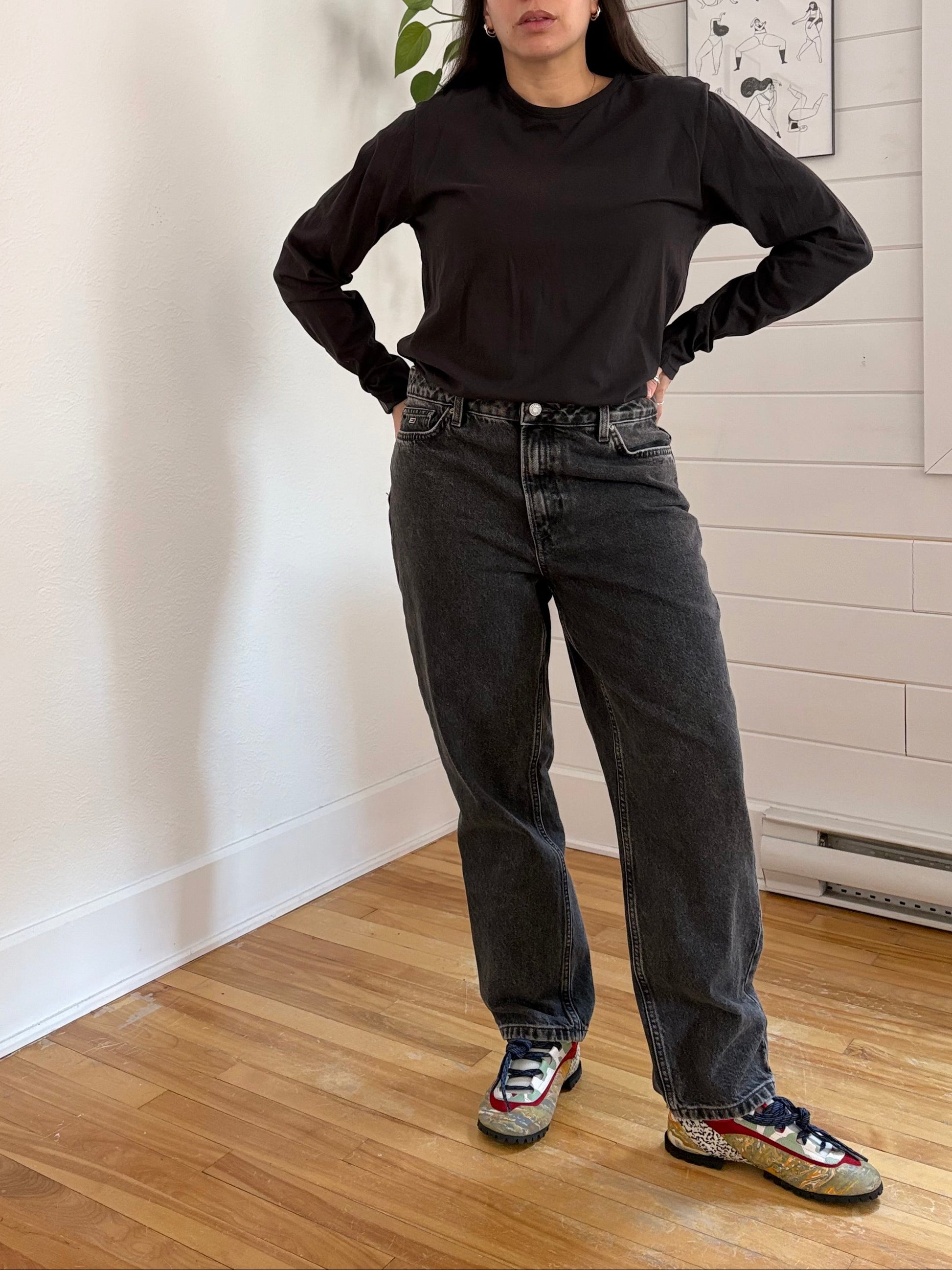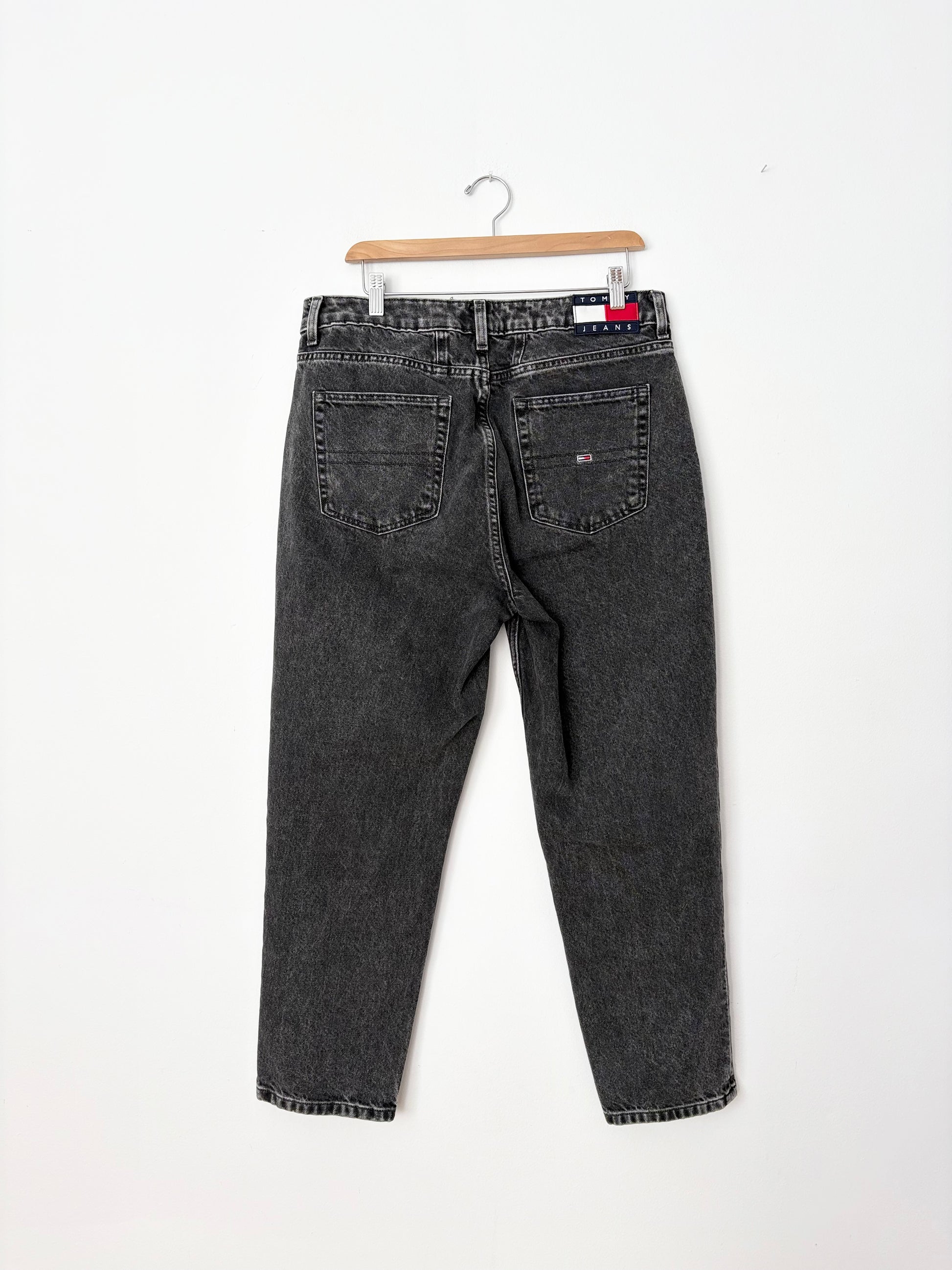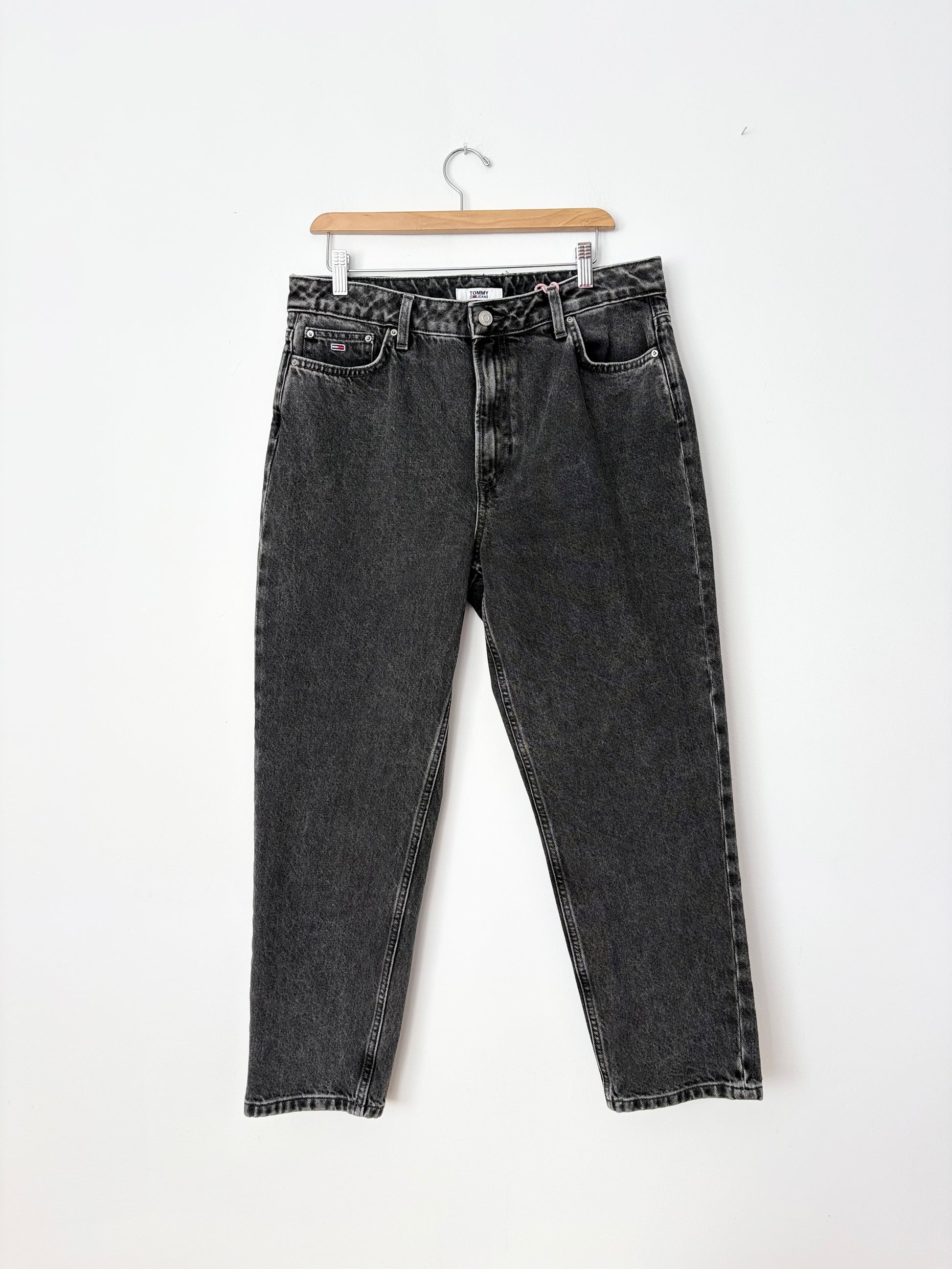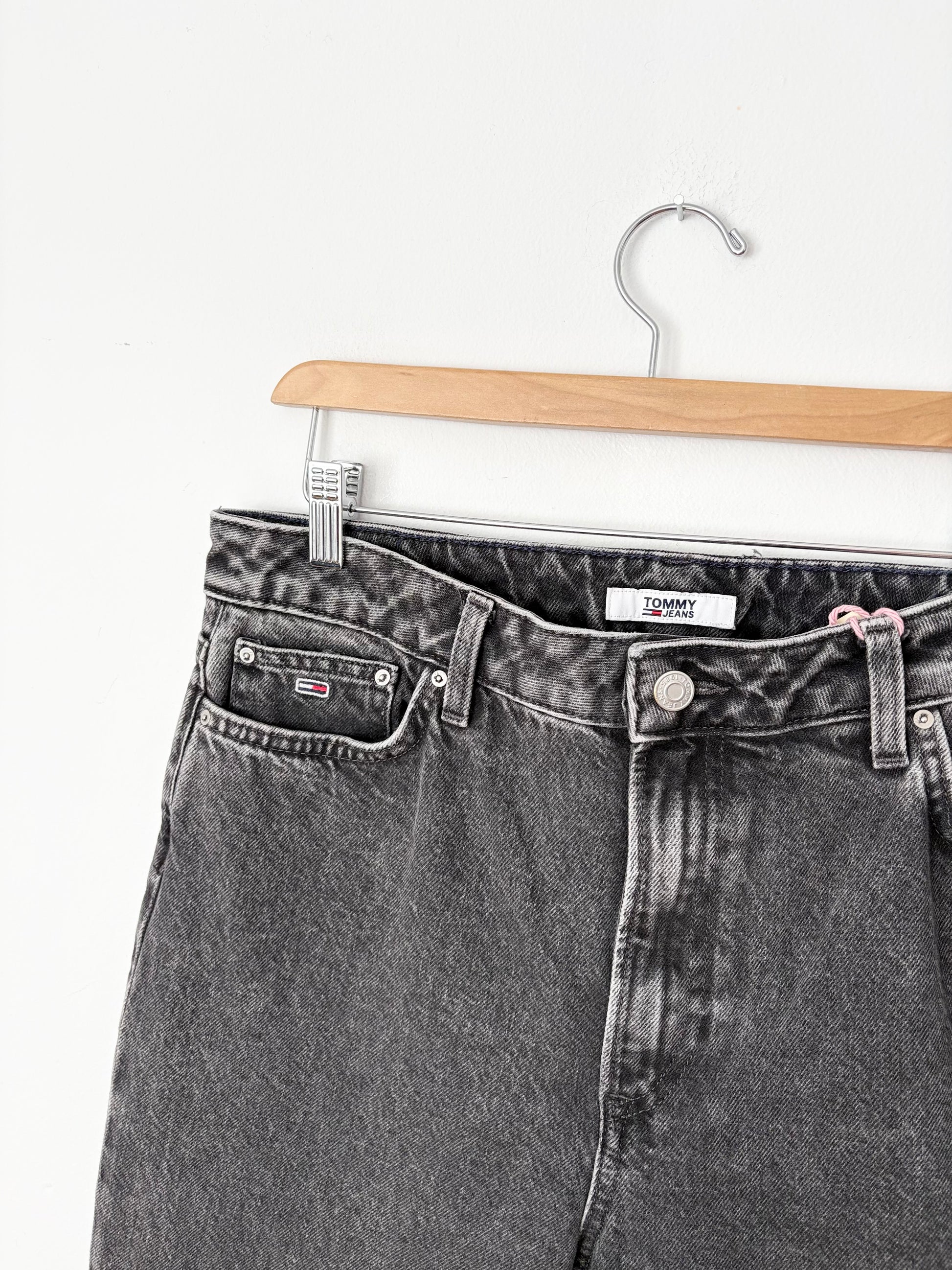 Faded black high rise straight leg jeans with Tommy back patch & logo embroidery on pocket