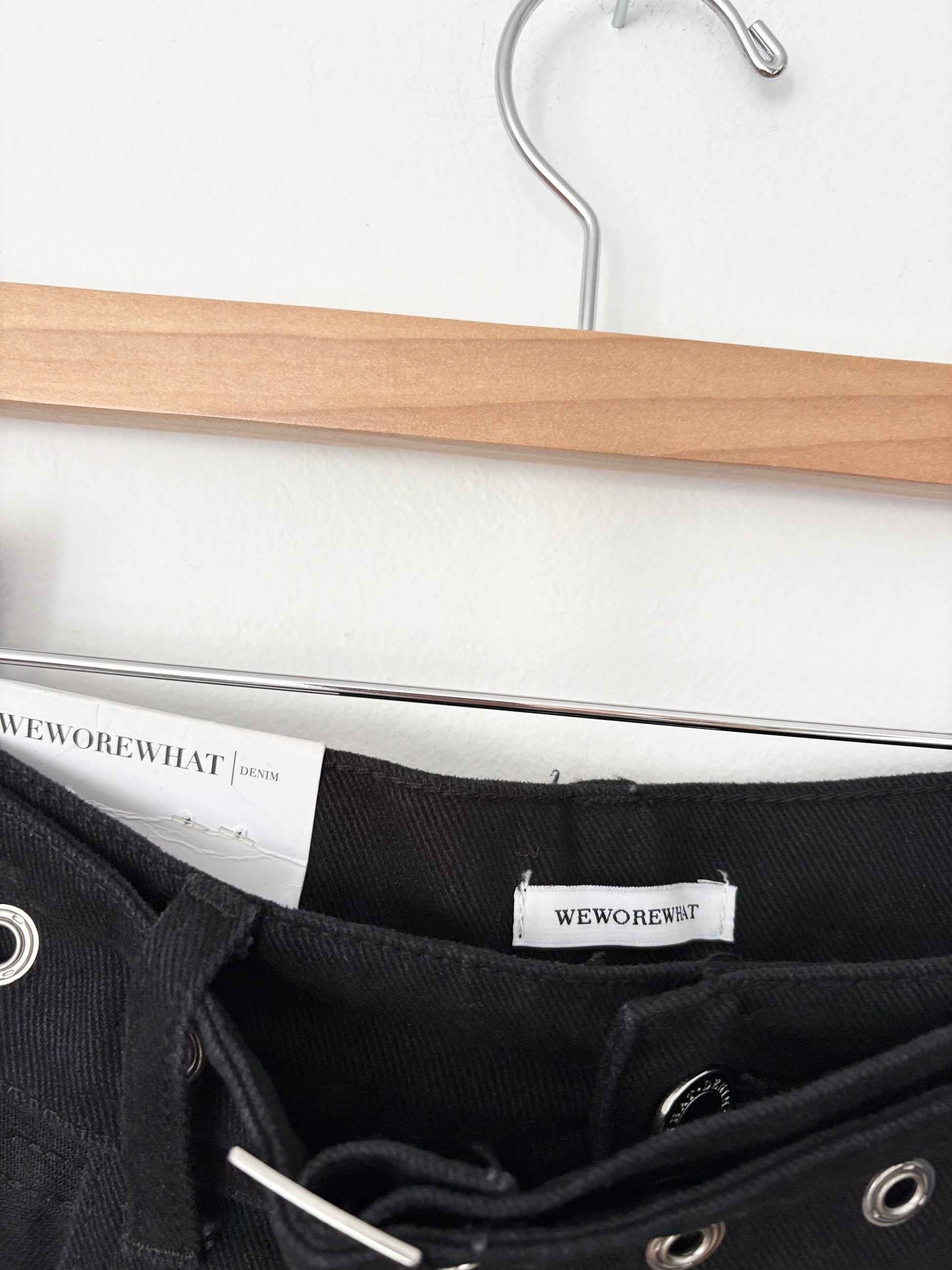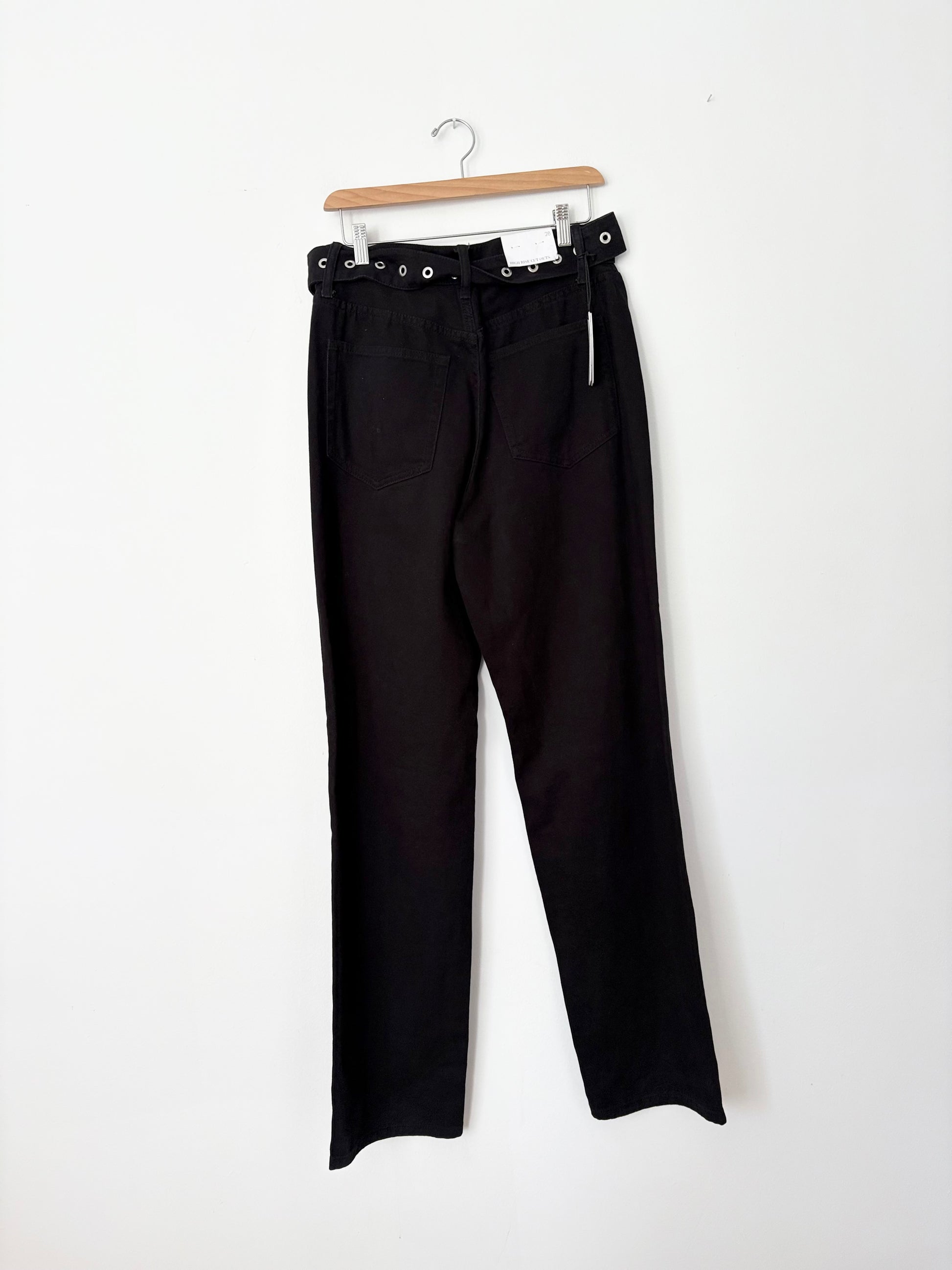 Black wide leg jeans with zip fly with button closure, side cut-out detail at pockets. Detachable belt included.