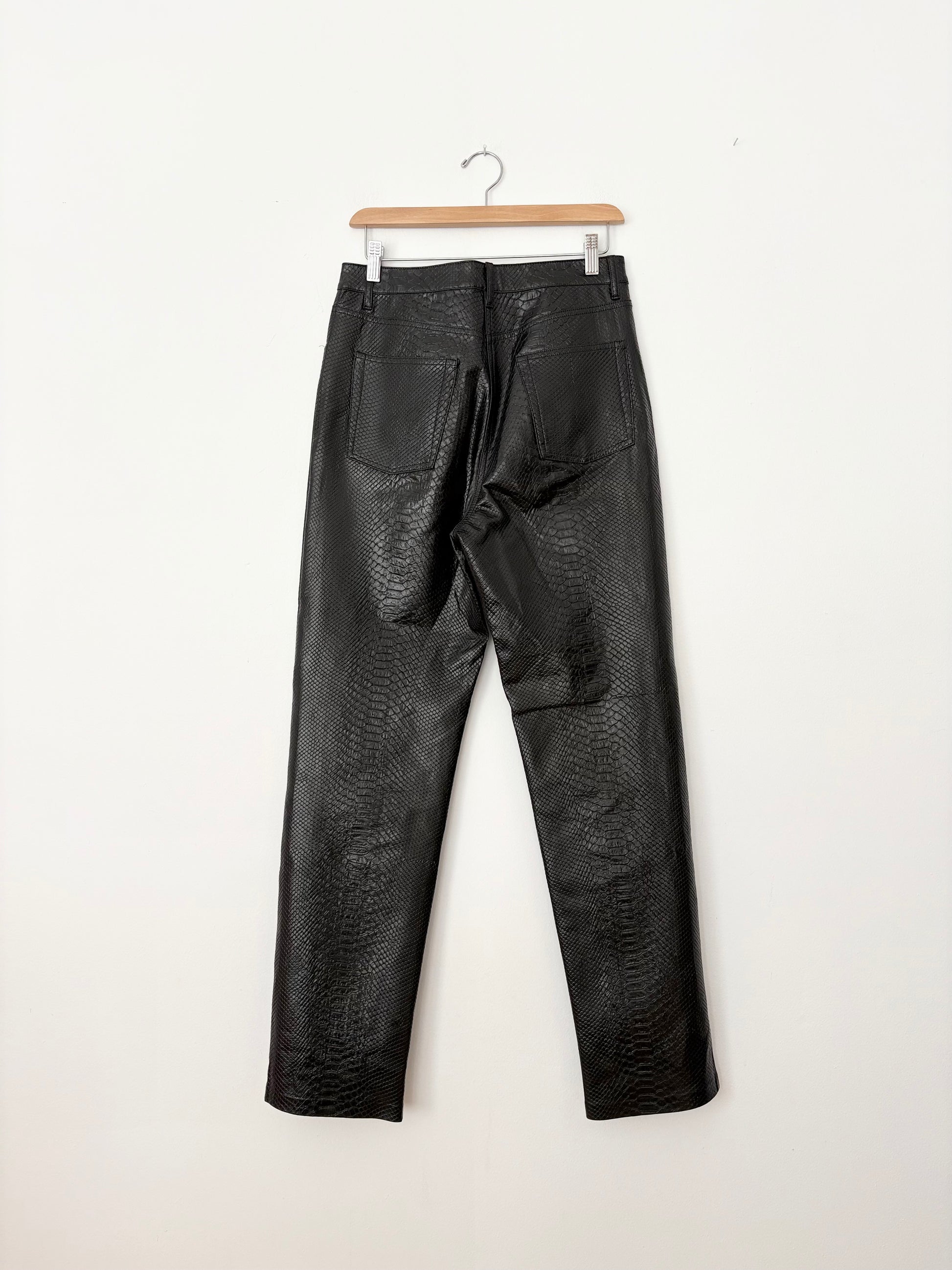 The one, the only, the Melina. These are high-rise straight-leg pants with five-pocket styling and a universally flattering fit. This version is made with innovative, python-embossed vegan leather that looks and feels like the real thing.
